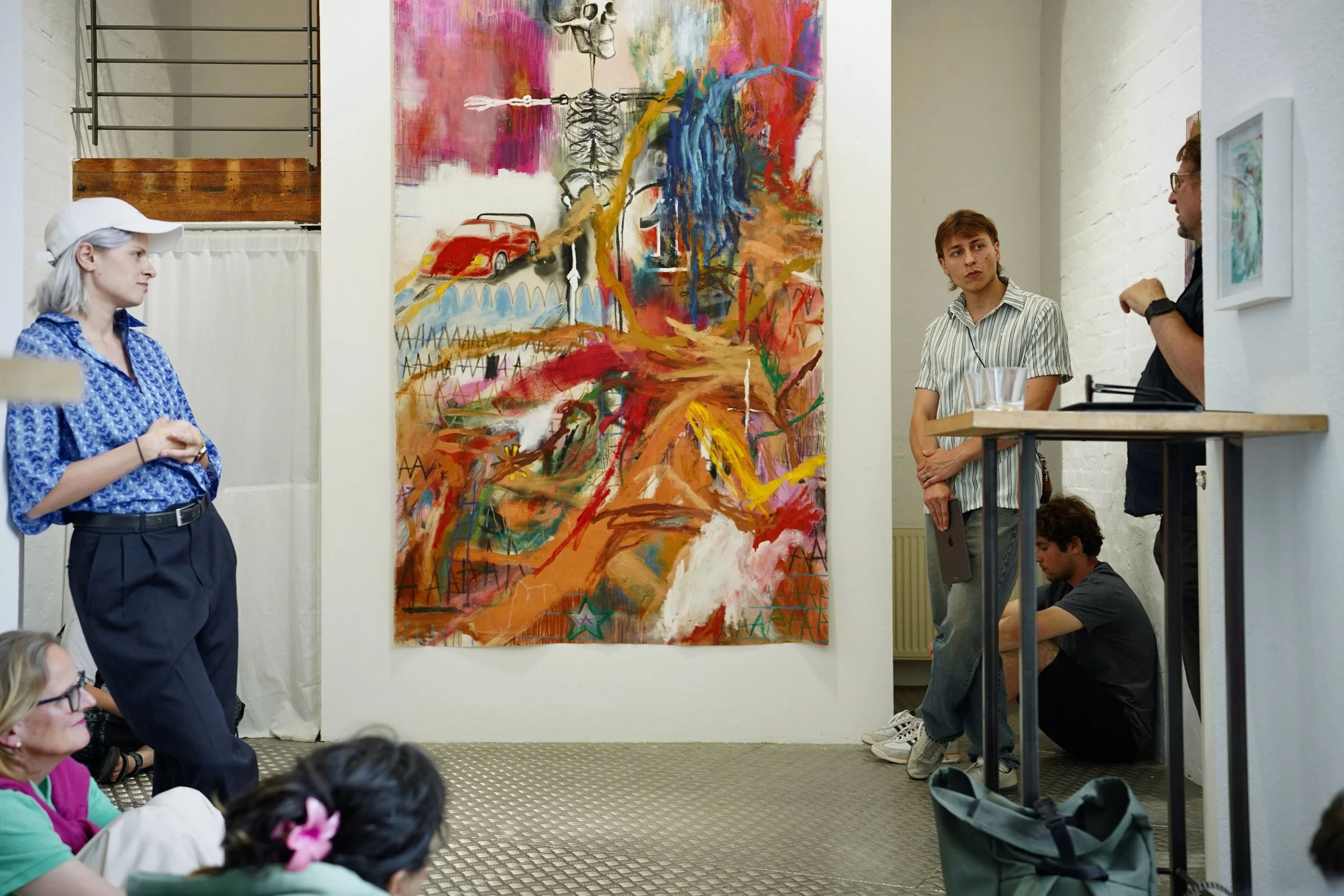 "Schlangen schländern" 2025, Mischtechnik auf Leinstoff, 157 x 125 cm